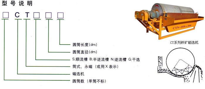 該類(lèi)設(shè)備利用永磁磁系所產(chǎn)生的磁力,將礦漿中的磁性礦物吸引到圓筒表面上來(lái),并隨著圓筒一起旋轉(zhuǎn),待脫離磁場(chǎng)作用后在重力、(刮板)作用下,排出機(jī)外,而非磁性物料從尾礦口排除,完成分選作用。