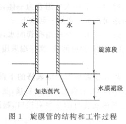 在離心力和重力的作用下,旋轉(zhuǎn)水流于旋膜管的出口形成張開的水膜裙。由于水膜裙自上而  下運(yùn)動(dòng),加熱蒸汽自下而上運(yùn)動(dòng),強(qiáng)化了水膜裙的波動(dòng),使水膜裙迅速進(jìn)入紊流狀態(tài),增強(qiáng)了加熱蒸汽的凝結(jié)放熱。旋膜管的結(jié)構(gòu)和工作過程如圖1。