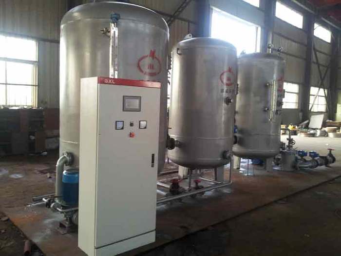 ①、真空除氧器除氧塔 除氧塔內(nèi)裝有銅制作霧化噴頭,每只噴頭處理水量恒定,從而得到噴霧效果。塔內(nèi)裝有填料層、傳質(zhì)塊,親水性能好。霧化的結(jié)果大大增加了水的脫氣面積,當(dāng)霧化的水滴繼續(xù)流經(jīng)無規(guī)則堆放的填料層時(shí),進(jìn)一步加強(qiáng)了脫氣效果。因此,雖然水在脫氣塔內(nèi)停留的時(shí)間很短,然而除氧效果很好。 ②、真空除氧器除氧水箱 除氧器運(yùn)行時(shí),水箱內(nèi)處于負(fù)壓。因此在高位安裝時(shí),水箱出口處與鍋爐給水泵進(jìn)口之間的凈距離不得小于11米。在低位安裝時(shí)(水箱出水口與鍋爐給水泵在同一高度),水箱出水口要接上引水泵機(jī)組,使負(fù)壓水升壓后進(jìn)入鍋爐給水泵,水箱上裝有人孔,便于維修保養(yǎng)時(shí)使用。 ③、水噴射真空泵機(jī)組 真空除氧器泵組由水噴射真空泵、循環(huán)水箱、離心泵組成。離心泵將循環(huán)水通過噴嘴造成高速水流而產(chǎn)生真空。本水噴射真空除氧裝置可利用軟化兼作循環(huán)水,溫度不會(huì)升高,因而可得到較高的真空度,提高除氧效果。方法是利用原有的軟化水水箱兼作循環(huán)水箱,節(jié)約設(shè)備及占地面積。 ④、引水泵機(jī)組 在除氧器低位安裝時(shí)使用,通過該泵將負(fù)壓的除氧水升壓后進(jìn)入鍋爐給水泵。 ⑤、電磁閥 為避免軟化水進(jìn)水泵不工作時(shí)軟化水進(jìn)入除氧器,因此在除氧器進(jìn)水管道中要裝電磁閥,電磁閥的啟閉由水位自控報(bào)警器控制,電磁閥選用Dg50,Pg16工作介質(zhì)水溫小于等于60℃的規(guī)格。電磁閥要水平安裝。 ⑥、水位自控報(bào)警器及管式液位計(jì)或其它液位控制器 水位自控報(bào)警器由傳感器與控制報(bào)警器組成。傳感器與液位計(jì)裝在除氧水箱上?刂茍(bào)警器放在室內(nèi)操作臺(tái)上?刂茍(bào)警器控制軟化水進(jìn)水泵與電磁閥兩者的動(dòng)作。 (除氧器的進(jìn)水量就是除氧器的出力,除氧器的出水量與鍋爐運(yùn)行時(shí)的進(jìn)水量有關(guān),一般不超過除氧器的額定出力,因此除氧器的進(jìn)水量略大于出水量。當(dāng)除氧水箱內(nèi)水位在正常水位的上限時(shí),水位自控報(bào)警器動(dòng)作,使得軟化水進(jìn)水泵停止運(yùn)轉(zhuǎn)與電磁閥關(guān)閉。此時(shí)由于除氧器仍在出水,水位逐漸下降,當(dāng)水位在正常水位的下限時(shí),軟化水進(jìn)水泵有開始運(yùn)轉(zhuǎn)同時(shí)電磁閥也打開,水位逐漸上升,從而水箱內(nèi)水位可保持在正常水位范圍內(nèi)。超出正常水位的上限或下限時(shí)還可以報(bào)警,此時(shí)可手控進(jìn)行強(qiáng)制進(jìn)水或使軟化水進(jìn)水泵停止運(yùn)轉(zhuǎn),除氧器的進(jìn)水是間斷進(jìn)行的,除氧器的出水可以是連續(xù)也可以是間斷的(與鍋爐操作有關(guān))要求盡可能連續(xù)進(jìn)水。