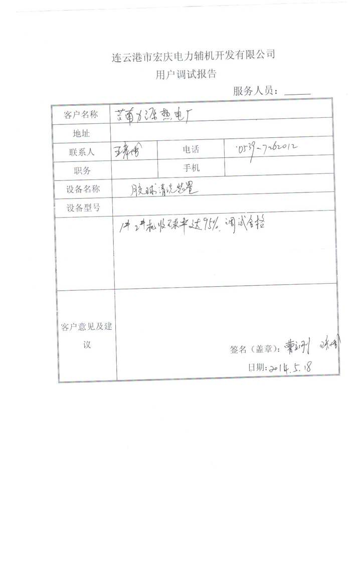 膠球清洗裝置供貨及安裝技術(shù)要求 需方:莒南力源熱電有限公司 (以下簡稱甲方) 供方:連云港市宏慶電力輔機(jī)開發(fā)有限公司 (以下簡稱乙方) 設(shè)備技術(shù)規(guī)范 1、本協(xié)議適用于莒南力源熱電有限公司C15-4.90/0.981及C25-4.90/0.98機(jī)組的凝汽器膠球清洗裝置。供貨范圍為兩臺機(jī)組所配套的兩套膠球清洗裝置,招標(biāo)方面供貨應(yīng)滿足本體及輔助設(shè)備的功能設(shè)計、結(jié)構(gòu)、制造、性能、安裝和試驗等方面的技術(shù)要求。 2、凝汽器膠球清洗裝置安裝在凝汽器循環(huán)水出水口垂直循環(huán)水管道上。 3、乙方中標(biāo)后應(yīng)依據(jù)現(xiàn)場情況與甲方確定裝置系統(tǒng)安裝位置,并出系統(tǒng)布置安裝圖紙,經(jīng)甲方確認(rèn)后作為施工依據(jù)。 4、凝結(jié)器技術(shù)參數(shù): 。1)型式:N-2400-6 分列二道表面式 冷卻水量:6500t/h 冷卻水溫33℃ 冷卻水工作壓力:0.15-0.25Mpa 水質(zhì):淡水 銅管規(guī)格:¢18×1×7850mm 銅管內(nèi)平均水流速 20m/s 。2)型號:N-1250 雙流程二道表面式 冷卻水量:3200-4000t/h 冷卻水溫33℃ 工作水壓:0.15-0.25Mpa 銅管規(guī)格:¢22×1×4562mm 二、技術(shù)要求: 乙方所提供的膠球清洗裝置必須是技術(shù)先進(jìn)、經(jīng)濟(jì)合理、成熟可靠的產(chǎn)品,能夠滿足機(jī)組各種運行方式的需要。 1、在設(shè)計工況下,膠球清洗裝置的收球率測試方法為連續(xù)運行24小時,收球半小時,保證收球率≧98%。 2、膠球投運時,收球網(wǎng)運行正常時水阻不大于300mmH2O。 3、收球裝置設(shè)置人孔以便于檢修,收球網(wǎng)及殼體有足夠的剛度、不變形及各轉(zhuǎn)動部件保證靈活不卡。 4、收球網(wǎng)用316L不銹鋼板,厚度6mm,網(wǎng)眼為長形。 5、膠球泵型號 。1)型號:125ss-21 流量100t/h 揚程21m 轉(zhuǎn)速1460r/min 吸上真空度6.8米 電動功率15KW 。2)泵與電機(jī)配供統(tǒng)一的共用底座,并配泵與電機(jī)之間的聯(lián)軸器及防護(hù)罩。 (3)裝球室型號:ZQS-300-1 膠球加球室的進(jìn)出口采用法蘭連接,并配有不銹鋼球閥(采用316L),并設(shè)有放水門及排空閥。 。4)二次濾網(wǎng):外殼壁厚10mm,濾網(wǎng)為316L不銹鋼網(wǎng)材質(zhì),濾網(wǎng)厚度6mm。設(shè)置人孔以便于檢修,不能影響進(jìn)水量。 三、現(xiàn)場安裝及試驗: 1、現(xiàn)場安裝所有材料及管道、閥門均由乙方自行配帶。(管道用無縫鋼管,閥門均為電動不銹鋼球閥316L,廠家:揚州超能電動閥門有限公司。包括現(xiàn)場管道除銹刷漆等工作) 2、設(shè)備安裝完畢后,經(jīng)甲方驗收合格,再進(jìn)行下一步的調(diào)試及試運行,并做收球率試驗。 四、性能保證: 投標(biāo)方按本招標(biāo)書的要求,保證膠球清洗裝置的可靠性。 (1)收球率:≧98%。 。2)收球網(wǎng)投運正常時阻力:不大于300mmH2O。 。3)設(shè)備能滿足機(jī)組年運行大于6000小時的要求。 。4)設(shè)備使用壽命保證10年。 二〇一四年三月一日  新型膠球泵 收球網(wǎng)(專利)  電動二次濾網(wǎng)  電動裝球室  球閥  分匯器  PLC控制箱  膠球樣品  驗 收 報 告
